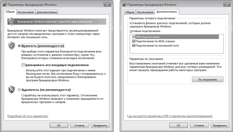 Слева в окне Центра обеспечения безопасности расположен список ссылок для доступа к параметрам настройки средств безопасности. Перейдите по ссылке Брандмауэр Windows, а затем Изменить параметры. В результате будет открыто окно, в котором настраиваются параметры работы брандмауэра. На вкладке Общие (рис. 7.13, слева) можно полностью отключить брандмауэр, установив переключатель в положение Выключить. Если контроль брандмауэра не требуется для какого-то одного подключения, перейдите на вкладку Дополнительно (рис. 7.13, справа) и снимите флажки возле подключения, защита которого не требуется. Помните, отключать брандмауэр Windows имеет смысл только в том случае, если вы планируете использовать аналогичную программу сторонних разработчиков. Отключение брандмауэра даже для одного сетевого подключения Центр обеспечения безопасности расценит как недопустимое снижение уровня защиты: в разделе Брандмауэр появится отметка Выкл., а всплывающие сообщения в области уведомлений будут напоминать вам о необходимости вернуться к прежним настройкам.