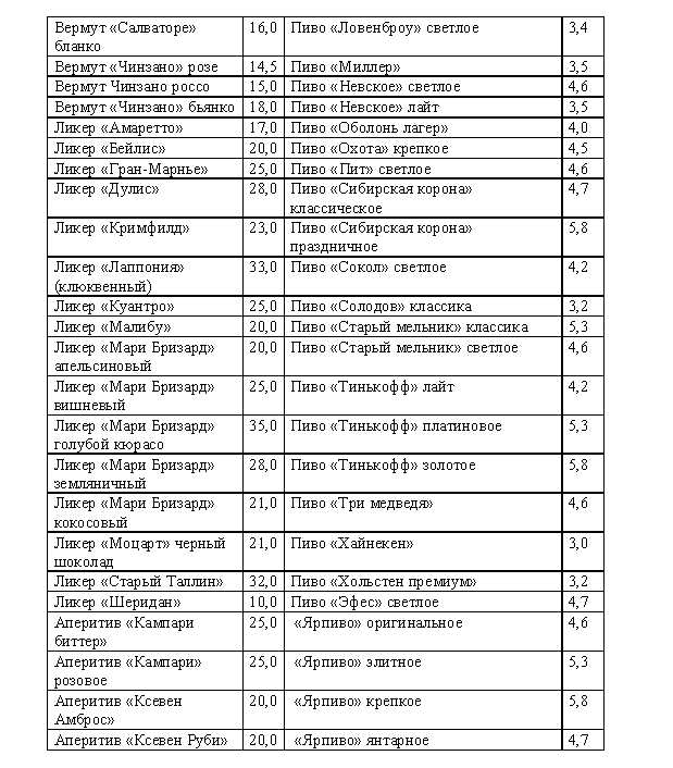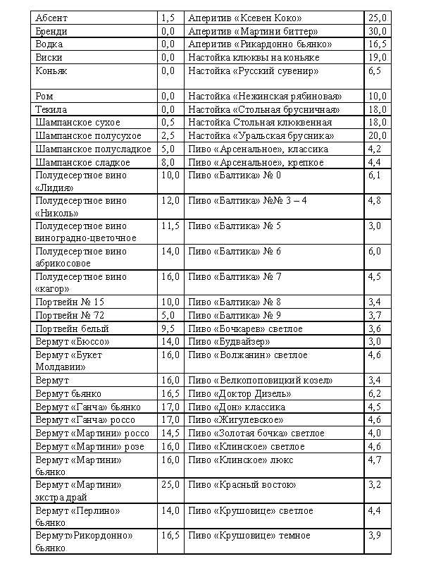 Сколько «стоят» алкогольные напитки вам будет нетрудно подсчитать, используя данные следующей таблицы: