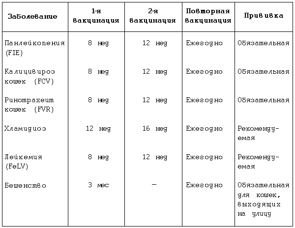 Предупредить развитие тяжелых заболеваний у кошек можно с помощью вакцинации. Одни прививки являются обязательными, другие желательными. Необходимо обратиться к ветеринару с просьбой составить график вакцинации для питомца (табл. 4).