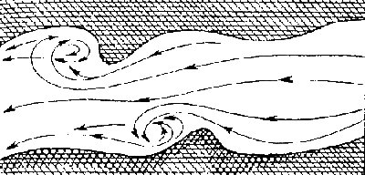 Теперь о собственно водоворотах, хотя суводь была его «прибрежным» вариантом. Когда на дне лежит огромный камень, коряга или затонувшее судно, то вода, набегая на них, создает поперечный вал, хорошо различимый на поверхности реки. За валом возникает зона пониженного уровня, в которую сверху и с боков, закручиваясь, устремляются потоки воды. Чем крупнее препятствие и выше скорость, тем мощнее водоворот. Однако вследствие непрерывности тока воды поступательное движение сохраняется и все плавающее, попавшее сюда, уносится по течению.