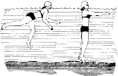 Вот почему обучение плаванию должно начинаться с опускания лица в воду, открывания глаз в воде, с выдохов в воду, промеров глубины «солдатиком» — эти упражнения надо поставить первыми и обязательными, Кроме того, начинающий пловец должен научиться мысленно успокаивать, убеждать себя: «Не достану дна — ничего страшного, не беда. Сил хватит, проплыву еще немного или сначала отдохну на спине и сделаю последние гребки к берегу».