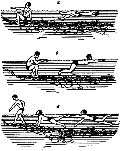 Обычно в подобных местах люди заходят в воду, ощупывая ногой, куда бы ступить дальше, балансируя и теряя равновесие. А ведь можно сделать проще: лечь на воду и, даже если очень мелко и нельзя свободно плыть, продвигаться вперед, перебирая руками по дну. Так же, на руках, можно вернуться назад, к самой кромке берега. Есть и другой способ преодолеть захламленное дно: зайдя в воду по колено, лечь и проплыть несколько метров на спине или на животе.