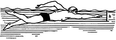 5) гребок руками от лица и сводящее движение ногами (ножницы закрываются); тело принимает почти вертикальное положение, голова поднята над водой для вдоха (1–2 секунды).