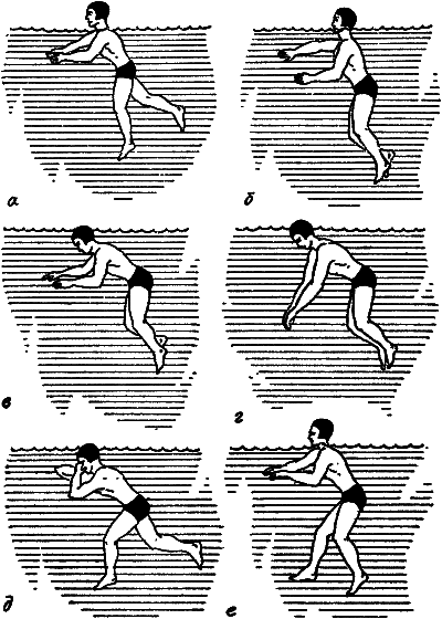 а) вдох, подготовка к погружению; б) начало погружения, притормаживание руками, расслабление; в) полное расслабление, начало медленного выдоха; г) расслабление, продолжение выдоха; д) под* ведение рук к лицу и разведение ног ножницами для толчка, позволяющего принять более вертикальное положение, конец выдоха; е) толчок руками и ногами, подъем головы, вдох.